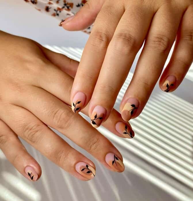 Прозора основа прикрашена широкими мазками нейтральних нюдових відтінків та чорним принтом у вигляді листя. Цей вишуканий, але простий дизайн нігтів стане ідеальним доповненням повсякденного образу.