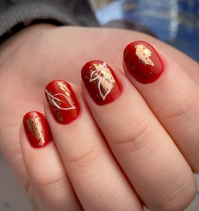 Додайте вогняного блиску у свій затишний осінній гардероб за допомогою цих червоних нігтів, золотої фольги та акцентів з білого листя. Використовуючи сміливі кольори, ви обов’язково привернете увагу до свого манікюру.