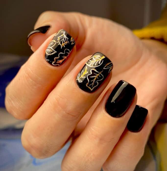 Ви точно не помилитеся, якщо оберете глянцеві чорні нігті з біло-золотими візерунками. Відчуйте себе впевненими, загадковими та сміливими одночасно з цим чудовим осіннім дизайном.
