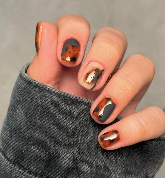 Є щось загадкове у цих матових графітових візерунках на глянсових черепахових нігтях. Якщо ви шукаєте ідею оригінального, сучасного та стильного осіннього дизайну для коротких нігтів, це те, що вам потрібно.