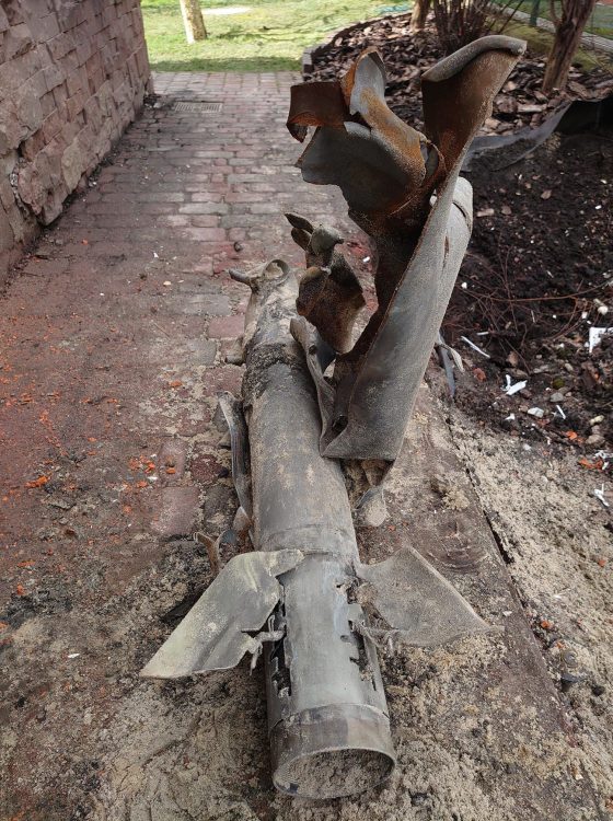 “Вчора сапери витягли те, що прилетіло до нашої оселі 14 березня від росіян-вбивць (зараз російські модератори від Цукерберга знову забанять пост за такі слова???). Має назву 9М22У. Снаряд для “Градів””.