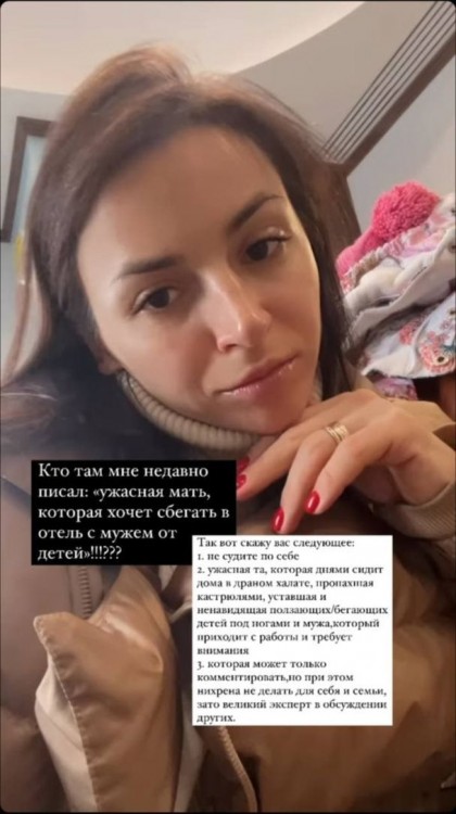 За їхніми словами, зірка навмисно поїхала у відрядження, щоб не бачити своїх дітей. Такі слова неабияк образили жінку, тому вона відповіла на закиди хейтерів. В Instagram-stories Ілона Гвоздьова повідомила, що жодного разу не вважала себе поганою матір’ю.