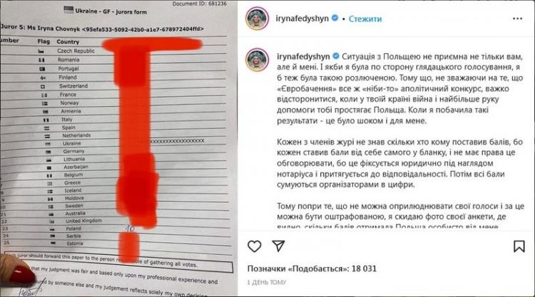 Ірина Федишин показала, як голосувала за Польщу на Євробаченні