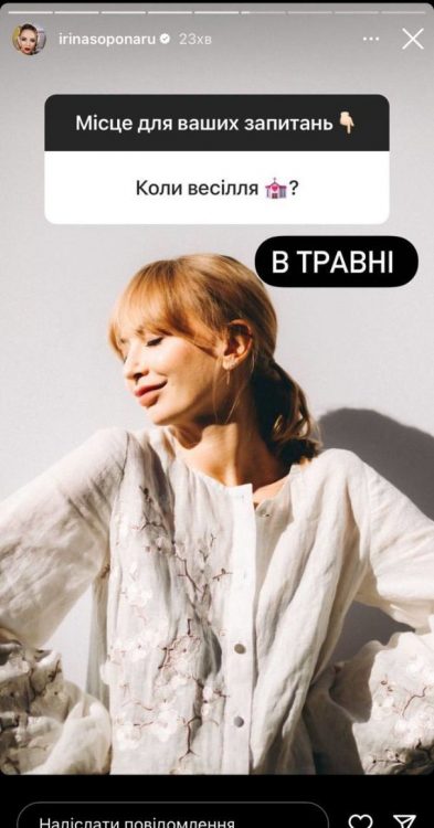 Нещодавно акторка розсекретила, коли пара зіграє весілля. Подробицями Ірина Сопонару поділилась в Instagram-stories. Як виявилось, закохані підуть під вінець не цього року. За словами зірки українського шоу-бізнесу, вони планують зіграти весілля у травні 2024 року.
