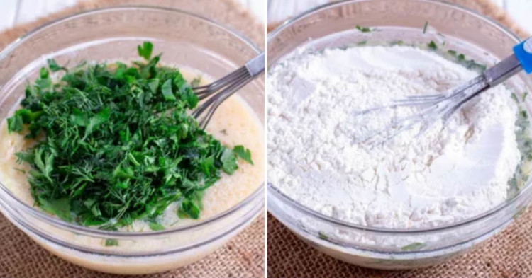 Перемістіть в молочно-яєчну суміш віджаті кабачки і натертий сир. Туди ж відправте дрібно рубану зелень. Перемішайте інгредієнти. Поступово додавайте до них борошно.