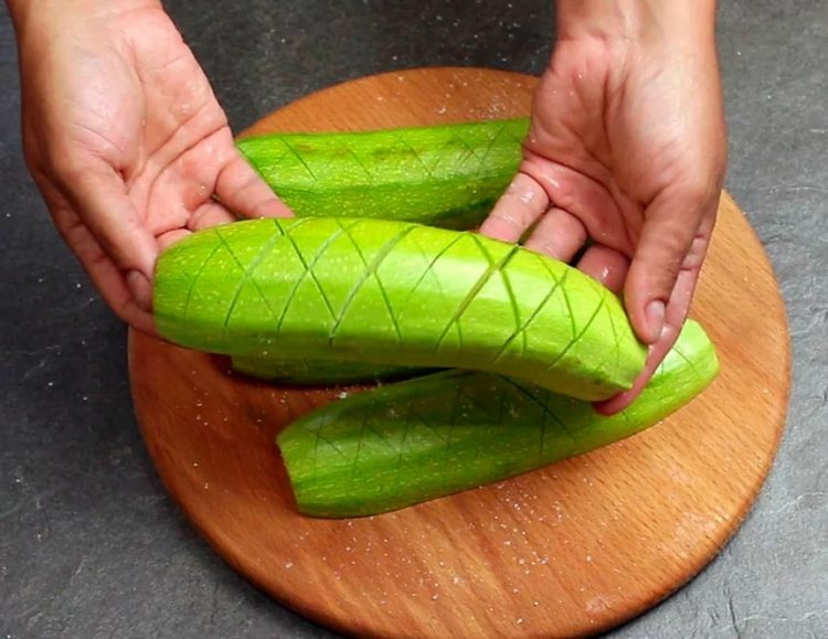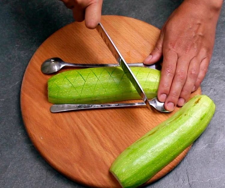 Кабачки промиваємо, розрізаємо вздовж навпіл і нарізаємо таким чином, як зображено на фото нижче. Поставивши по бокам дві ложки або вилки, щоб не розрізати кабачки до кінця, нарізаємо овочі навскоси спочатку з одного боку, потім з іншого.