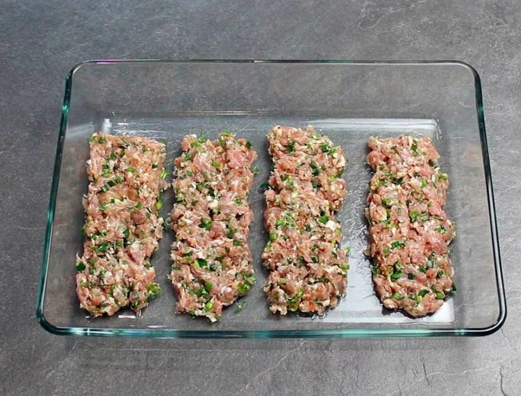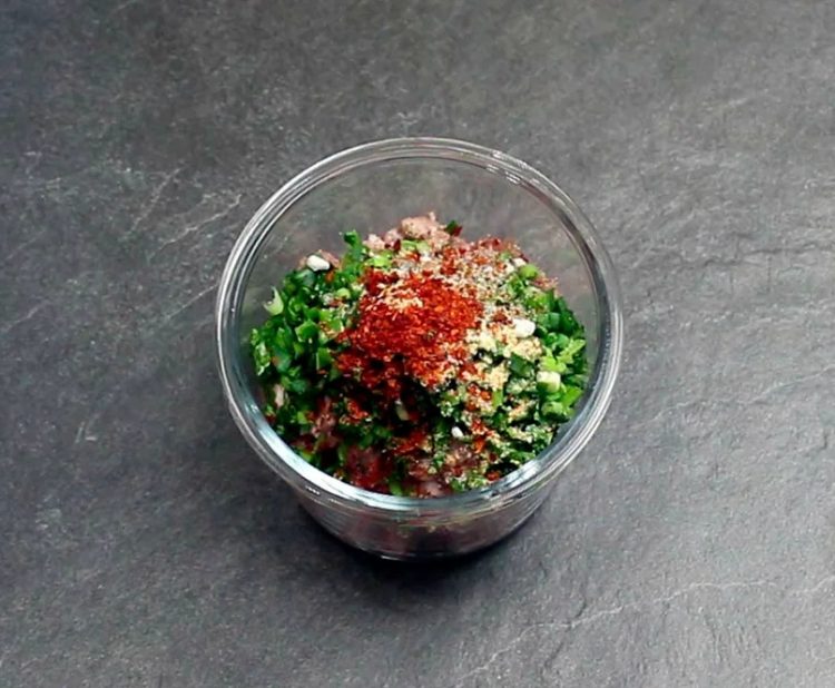 У фарш додаємо подрібнену зелень. Ми використовували зелену цибулю та петрушку, сіль, перець за смаком, по 1 чайній ложці сушеного часнику та паприки.