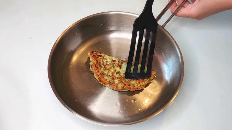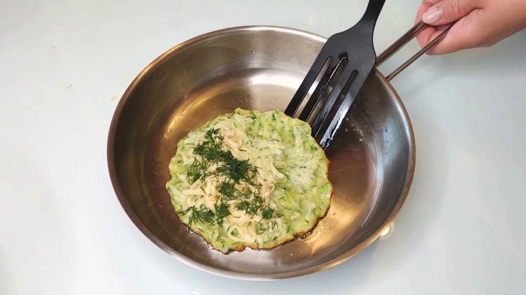 Обсмажуємо кабачковий “пиріжок” із двох сторін на повільному вогні ще по 2 хвилини, щоб внутрішня сторона “дійшла” і сир розплавився.