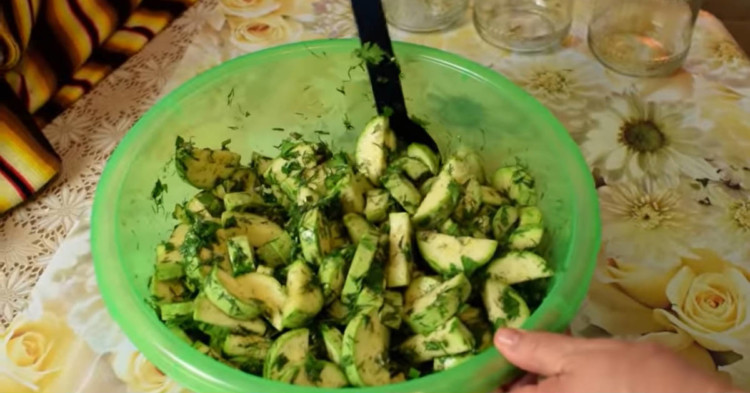 Дрібно наріж зелень, а гострий перець – тонкими кільцями. Додай їх до кабачків. Акуратно перемішай продукти. Залиш їх години на 3. Тим часом промий банки.