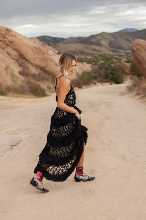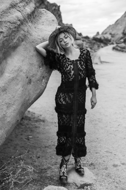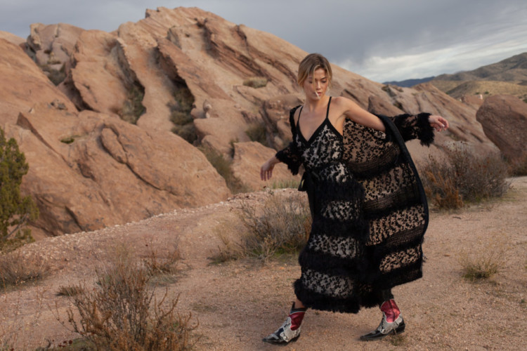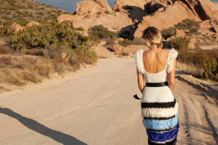 Увійшли в капсульну колекцію вже впізнавані кардигани з пухнастою фактурою, які Андрєєва доповнила різноманітними сукнями і топами. Палітру колекції дизайнер вибрала монохромний, щоб сфокусувати всю увагу на фактурі й тактильних відчуттях. Підкреслює складність текстур й локація – на тлі кам’яної пустелі кожна річ виглядає набагато м’якшою і приємнішою.