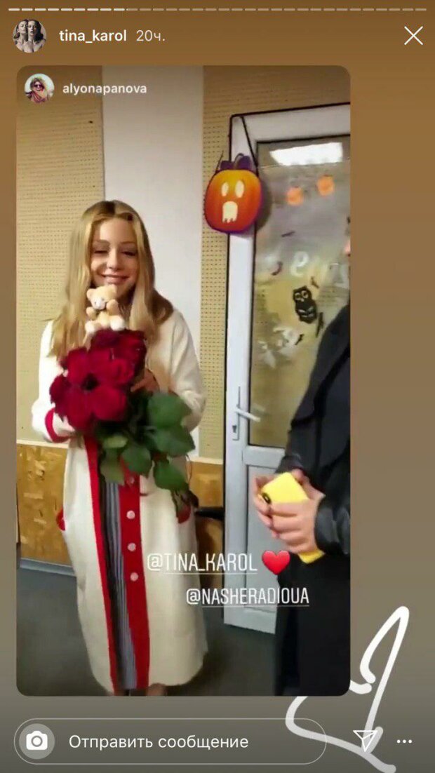 Відома українська співачка, тренер шоу “Голос країни” Тіна Кароль обожнює радувати фанатів новими знімками в Instagram. Знаменитість похвалилася в Сторіс кумедними фото, позуючи в студії “Наше радіо”. Так, артистка отримала букет троянд і маленького ведмежатка від ведучого Юрія Рихлика, однак у відповідь “дала йому гарбуза” за старою українською традицією, в знак відмови від його забавних залицянь.