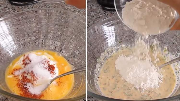 До суміші потрібно додати спеції: паприку, сіль та рубану зелень. Ретельно перемішайте виделкою та додайте борошно. У вас має вийти тісто, за консистенцією схоже до сметани.