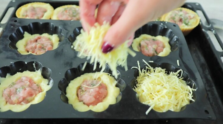 Мокрими руками формуємо кекси. У форму для кексів кладемо картоплю і робимо заглиблення.