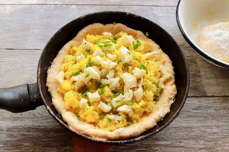 Другий шматок тіста розкотіть і покладіть зверху на картоплю, скріпіть краї пирога пальцями або виделкою. Змастіть тісто зверху маслом. Накрийте кришкою та відправте на вогонь. Готуйте пиріг на помірному вогні спочатку на одній стороні 5-7 хвилин.