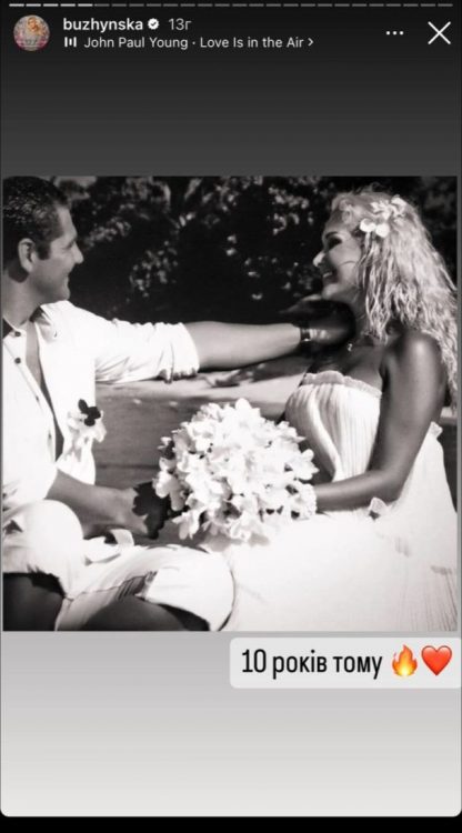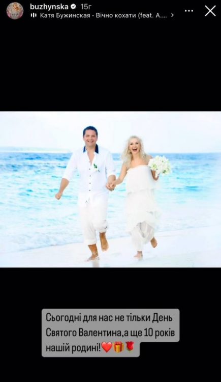 Співачка відверто зізналась, що назавжди запам’ятала цей день. Перед камерою співачка постала в розкішній сукні білосніжного кольору. Її коханий позував в сорочці та штанах. “Сьогодні для нас не лише День святого Валентина, а ще й 10 років нашій родині”, – заявила Катерина Бужинська.