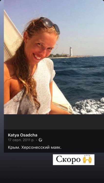 Катерина Осадча повідомила, що до анексії Криму постійно відпочивала на півострові. Телеведуча лише з усмішкою на обличчі пригадує свої відпустки. На архівному фото вона позує серед моря. Перед камерою Катерина Осадча постала із зібраним волоссям та без макіяжу.
