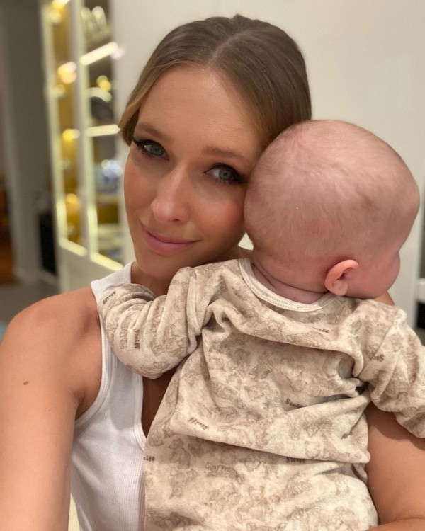 На фото жінка позує у білій майці з зав’язаним волоссям, Данило одягнутий у світло-коричневе боді на довгий рукав. На обличчя жінка нанесла легкий макіяж в нюдових тонах. Осадча ніжно обіймає малюка та притуляється до його голівки щокою.