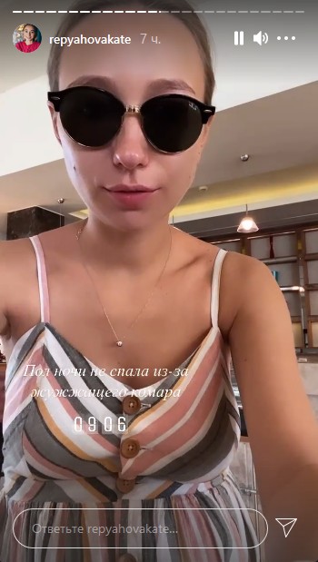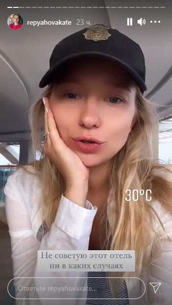 В Instagram-stories Катерина Реп’яхова поскаржилась, що дуже погано спала. Жінці не давали заснути комарі, які якимось чином залетіли в номер. Також, за її словами, дружині Віктора Павліка зовсім не сподобався сервіс у готелі. Катерина Реп’яхова не рекомендує його своїм фанам.