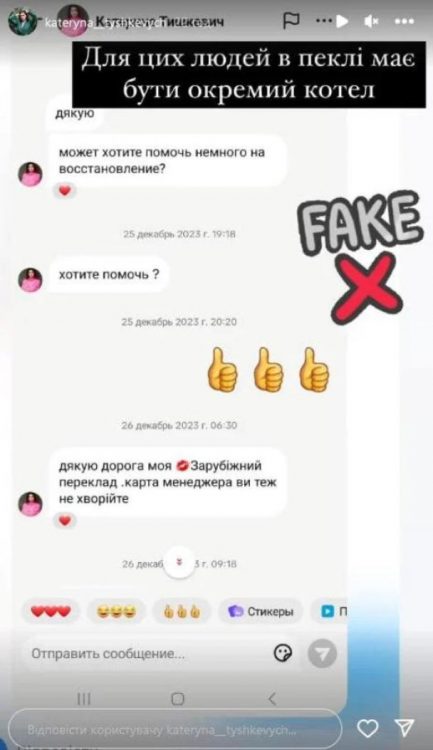 Акторка неабияк обурена, що від її імені шахраї збирають кошти. Також Катерина Тишкевич додала, що дізналась про фейковий акаунт від своїх знайомих. Вона відразу попередила фоловерів про шахраїв та заявила, що не збирає ніяких коштів. Наразі акторка дійсно проходить лікування. Проте, вона самостійно забезпечує себе коштами.