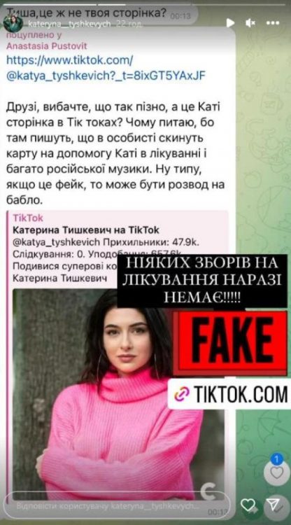 Важкохвора Катерина Тишкевич поділилась дуже неприємною новиною. Нещодавно акторка повідомила, що стала жертвою шахраїв. Подробицями жінка поділилась в соцмережі Instagram. Як виявилось, шахраї створили у TikTok фейковий акаунт від імені Катерина Тишкевич. В ньому вони публікують інформацію про збори коштів на лікування.