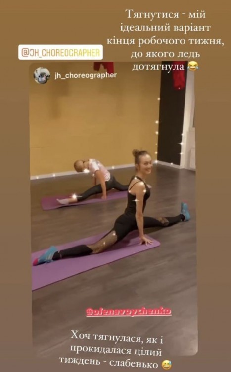 Вона показала чудовий шпагат й продемонструвала милу усмішку. Олена Войченко одягнула обтислі лосини чорного кольору та стильний топ. Свій спортивний образ жінка доповнила блакитними кросівками.
