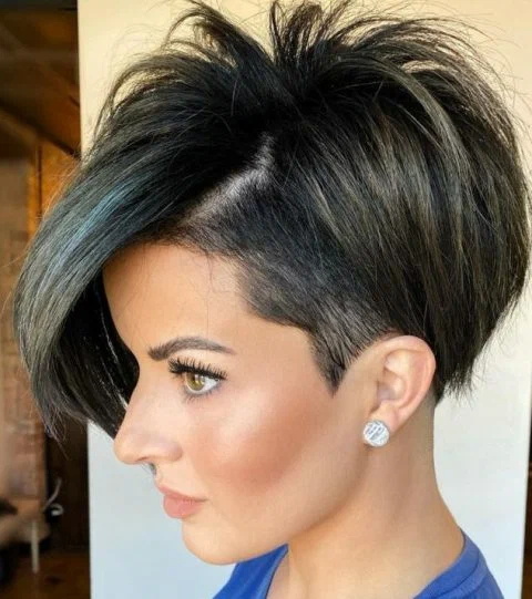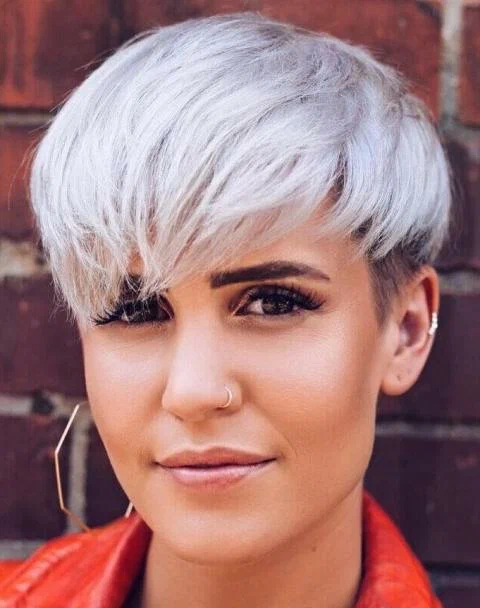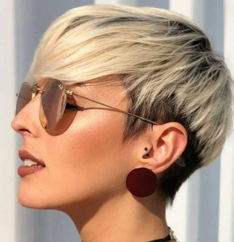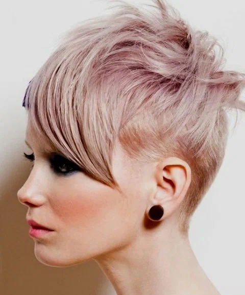 Це стрижка піксі. Але зверху залишили довге пасмо, вкладене у вигляді екстравагантного чубчика. Не обов’язково слідувати цьому один в один. Використовуйте цю тенденцію для розуміння тренду та для натхнення.