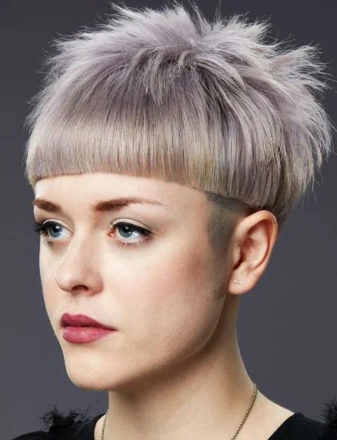На іншому фото ви бачите звичайну асиметричну стрижку з поголеною скронею. А ось чубок вкладений не плоско, а об’ємно, скульптурно, він розташований на відстані від чола. Це досягається за допомогою фіксуючих засобів. Ще можна використовувати легке начісування, щоб чубчик тримав форму.