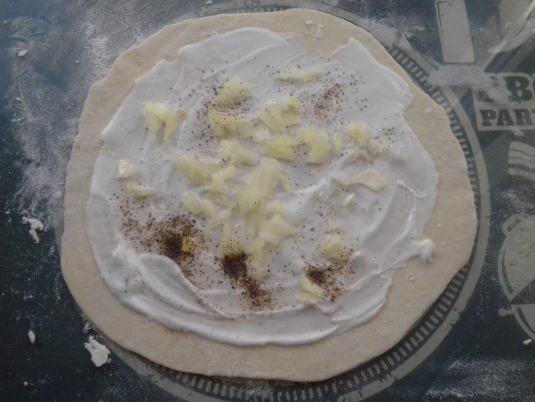 Змащуємо сметаною, посипаємо дрібно нарізаною ріпчастою цибулею, перчимо, солимо (не перестарайтеся).