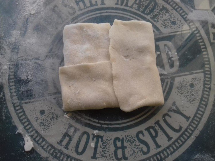Потім ділимо на шматочки розміром з невелике куряче яйце. Кожен шматочок розкачуємо дуже тонко – буквально в 1 мм. Працювати з тістом легко: воно відмінно розкочується, не рветься.