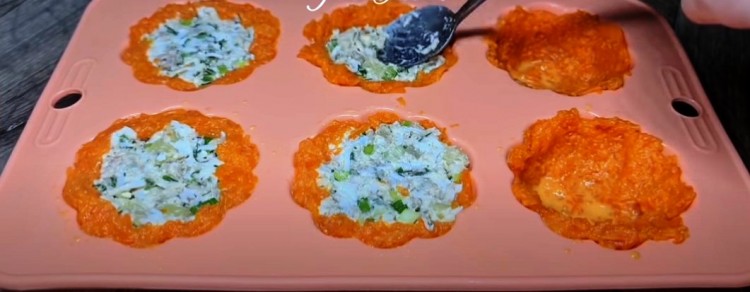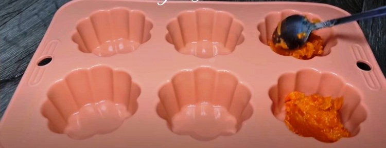 Потім додаємо до моркви желатин та викладаємо її у силіконові формочки. Зверху кладемо рибну начинку та відправляємо в холодильник на 8 годин.