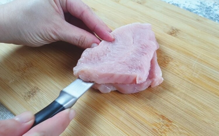 Беремо 3 шматка філе грудки індички. Їх необхідно помити і обсушити. Філе індички надрізаємо поперек, не прорізаючи м’ясо до кінця.