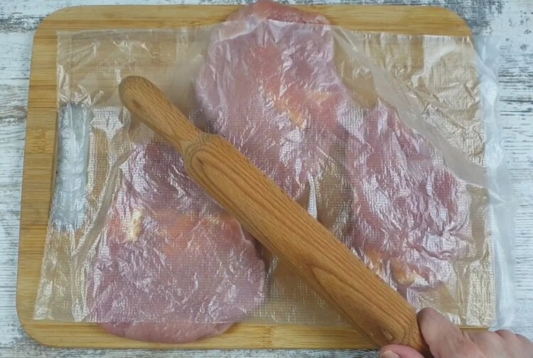 Накриваємо пакетом і відбиваємо качалкою. Бити треба акуратно, щоб м’ясо не розірвалося.
