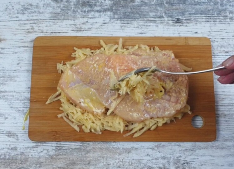 На тарілці або дошці викладаємо терту картоплю за розміром м’яса.