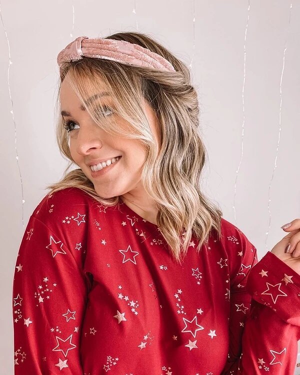Великі оксамитові обручі – супертренд, який гріх не використовувати в такій важливій справі, як створення новорічної зачіски. Зробіть легкі локони, зафіксуйте їх лаком, частину волосся закрутіть на обручі, як показано на фото. А тепер підберіть піжаму або затишний трикотажний костюм в тон – ідеальний образ для домашньої вечірки готовий.