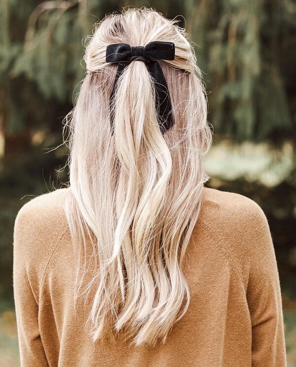Ще одна hair-тенденція сезону – банти. Така зачіска робиться просто, а виглядає дуже красиво і по-справжньому святково(особливо якщо ви використаєте оксамитовий або атласний варіант аксесуару). Можете використовувати шпильку з бантом, а можете – просту стрічку. В якості фінального штриха пройдіться по волоссю спреєм для рухомої фіксації.