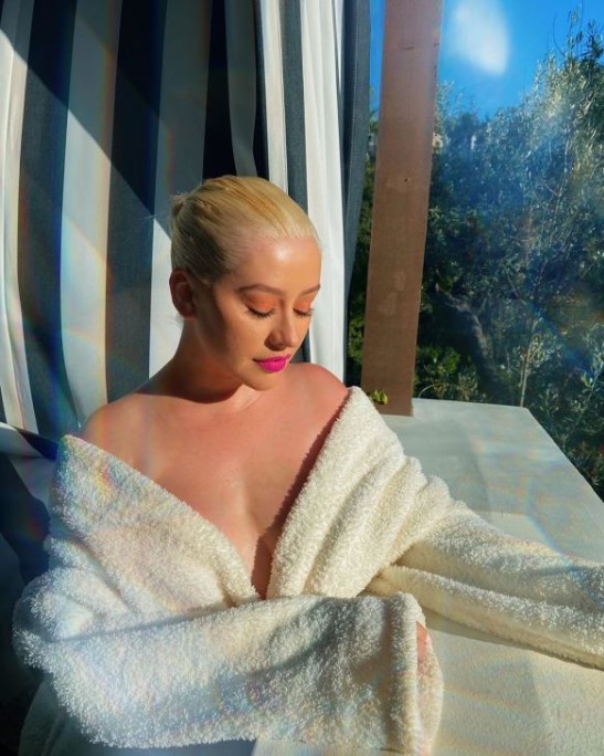 39-річна зірка опублікувала фото, на яких зображена на балконі. На ній: білосніжний м’який халат, одягнутий на голе тіло. Пікантності знімку додає приспущений рукав, що оголює плечі. Доповнила Агілера образ гладким високим пучком і яскравою помадою кольору фуксія.