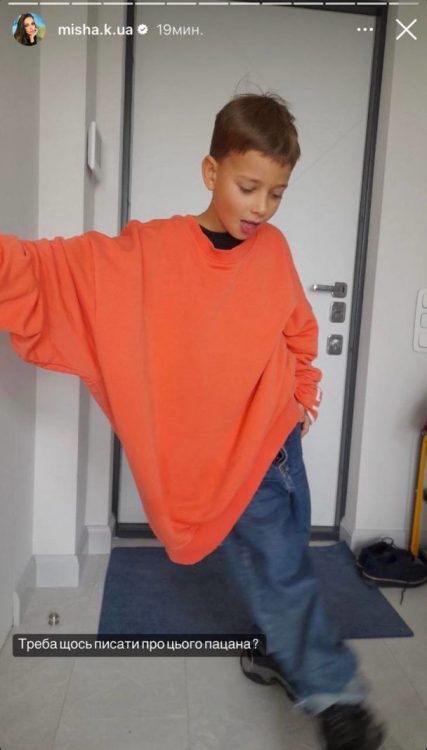 Перед камерою хлопчик постав у вбранні Ксенії Мішиної. Він одягнув помаранчеве худі своєї мами. А ще хлопчик приміряв її сумочку. На фото 10-річний Платон усміхався та демонстрував позитивні емоції.
