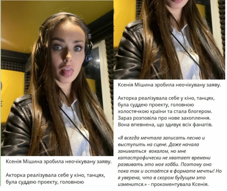 Проте, наразі в жінки дуже мало вільного часу, тому вона постійно відкладає свою мрію на пізніше. За словами знаменитості, Ксенія Мішина гарно співає й має всі шанси підкорити шоу-бізнес у новому амплуа.