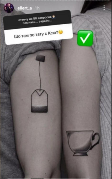 Закохана пара продемонструвала парні татуювання. На своїй сторінці в Instagram Олександр Еллерт запостив фото, на якому показав руку коханої. Також він похизувався власним татуюванням, яке зробив у вигляді чайного пакетика.