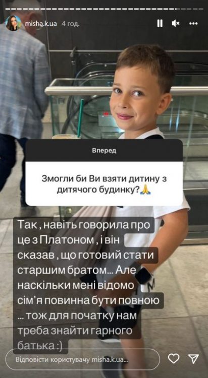 В соцмережах Ксенія Мішина часто спілкується зі своїми підписниками. На цей раз один з них поцікавився, чи змогла б акторка взяти дитину з дитячого будинку. Ксенія Мішина із задоволенням відповіла на це запитання.