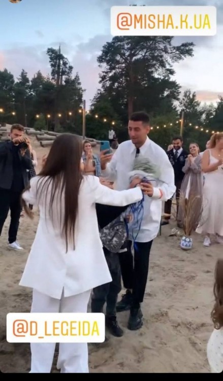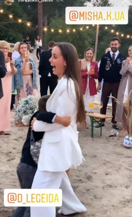 Ксенію Мішину відразу обійняв син, а пізніше підійшов Олександр Еллерт. Екскоханий акторки з’явився на весіллі у білосніжній сорочці та чорних штанах. Він зворушливо взяв Мішину за руку та засвітив щиру усмішку.
