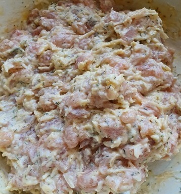 До порізаного філе додаємо натертий на дрібній тертці твердий сир, яйця, кріп, сіль, перець, майонез.