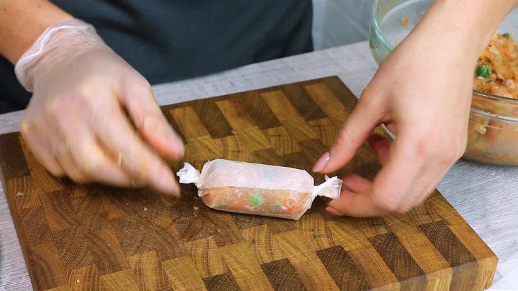 Закручуємо ковбаску по краях, виходить м’ясна цукерка.