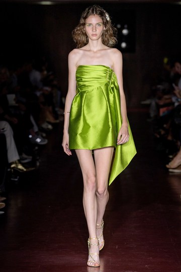 При своїй видимій складності, кислотний зелений позбавляє вас від необхідності сушити голову над вибором прикрас – вони вам взагалі не знадобляться. Якщо подивитися покази Versace, Peter Pilotto і Carolina Herrera, стане очевидно, що, вибираючи довжину міні у відтінку кислотного яблука, краще робити ставки на щільні тканини на зразок атласу. Якщо ж хочеться надіти довгу зелену сукню, тут ви можете пограти з мереживом і прозорим шовком, як на шоу Valentino і Christopher Kane.