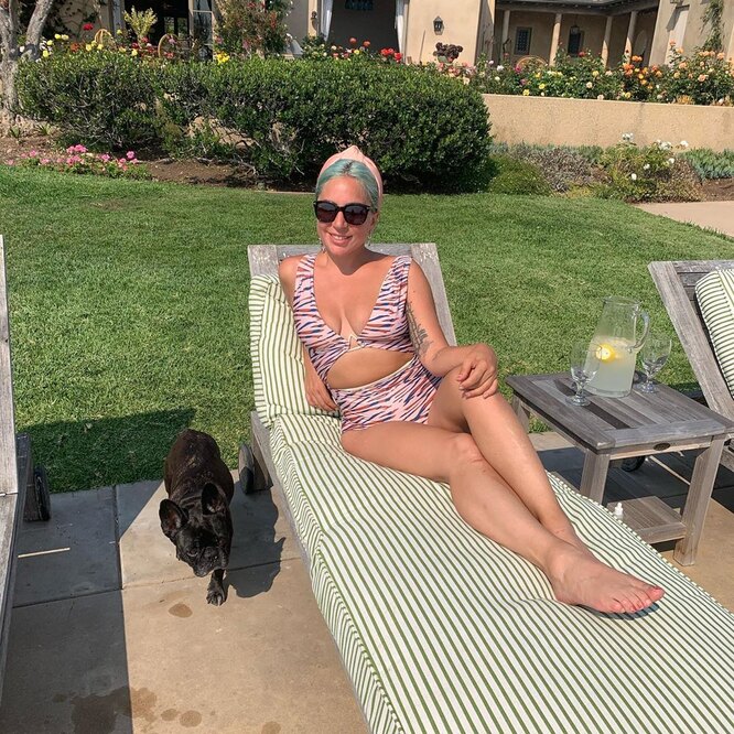 Леді Гага показала, як проводить вихідні у власному будинку. Вона розслабляється біля басейну, користуючись можливістю позасмагати на сонці і “зловити” останні літні дні. Співачка приміряла сміливе бікіні з насиченим принтом. Трусики з завищеною талією підкреслили красиві стегна зірки, а глибокий виріз бра з ефектом пуш-апу вигідно виділив її спокусливі груди.