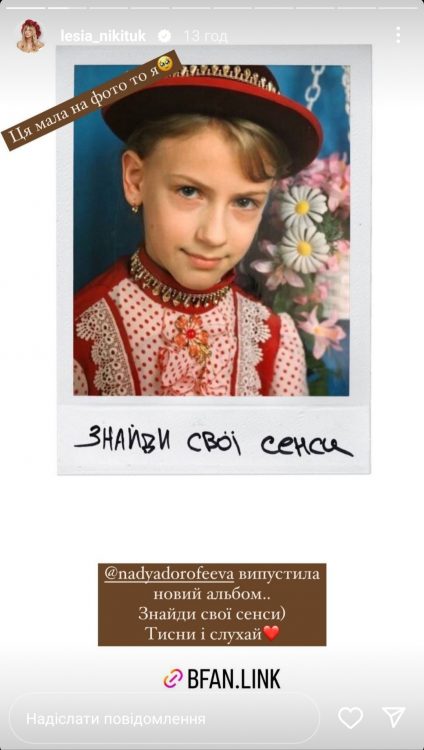 “Ця мала на фото – це я. Надя Дорофєєва випустила новий альбом. Натискай і слухай”, – написала Нікітюк у Instagram-сторіс.