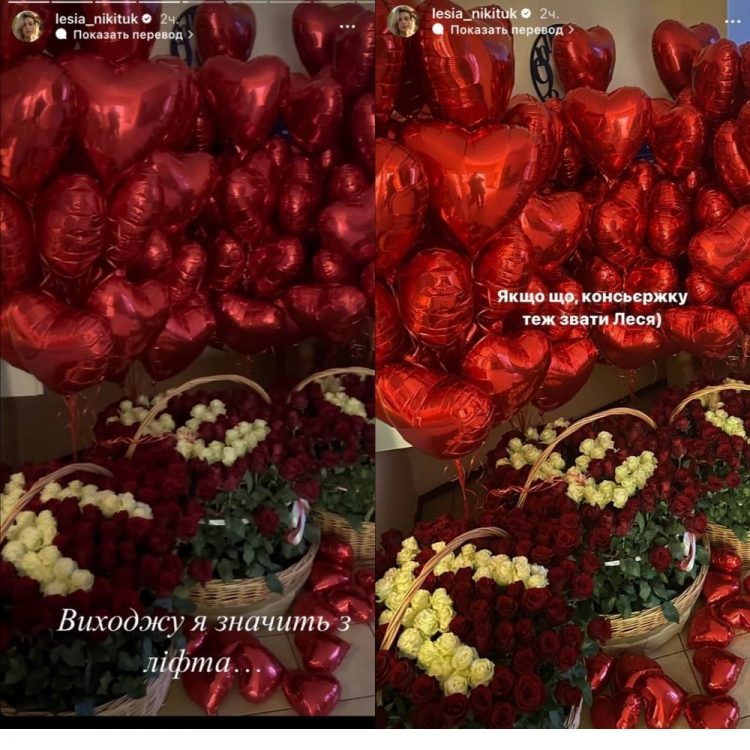 В Instagram-stories вона опублікувала кадри, на яких продемонструвала букети з червоних та білих троянд, якими було викладено ім’я “Леся”. Окрім квітів залицяльник залишив чимало повітряних кульок у формі червоного серця.