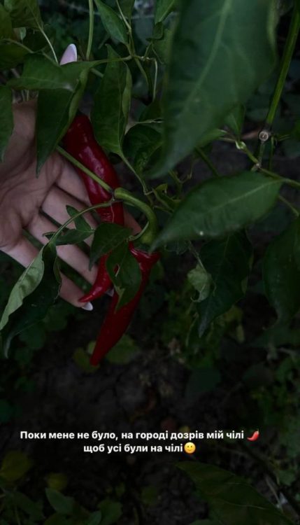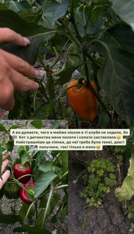 Знаменитість показала стиглий перець, помідори чері та перець чилі. Телеведуча розповіла, що з самого дитинства мама привчала її до того, як правильно вирощувати фрукти та овочі. “А ви думаєте, чого я майже ніколи в ті клуби не ходила, бо Кет з дитинства мене полоти і сапати заставляла. Найстрашніше це сіянка, до неї треба були тонкі, довгі пальчики, такі тільки в мене”, – заявила зірка українського шоу-бізнесу.