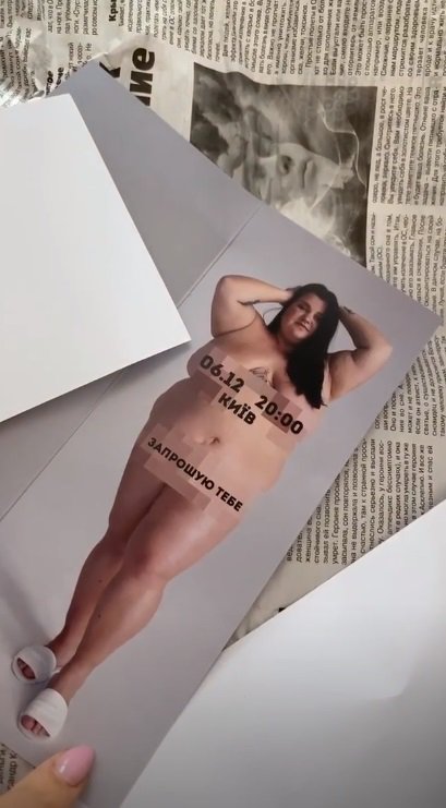 На одному з них зірка в чорному купальнику, а на другому – повністю оголена. Інтимні місця прикриті написами з датою і місцем концерту і словами “запрошую тебе”.