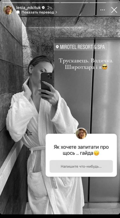 Вона позувала перед дзеркалом та мило усміхалась. Блогерка зібрала волосся в пучок, а на тіло накинула махровий халат. Своєю світлиною Леся Нікітюк натякнула, що планує сходити на спеціальну лікувальну процедуру, яка допомагає повністю розслабитися.